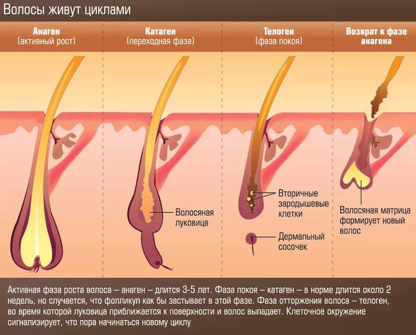 Жизненный цикл волос протекает в 3 фазы, которые постоянно повторяются.