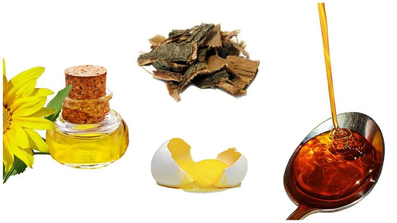 Состав: кора дуба (2 столовые ложки), мед (2 столовые ложки), яичный желток (1 штука), подсолнечное масло (1 столовая ложка), кипяток (300 мл)