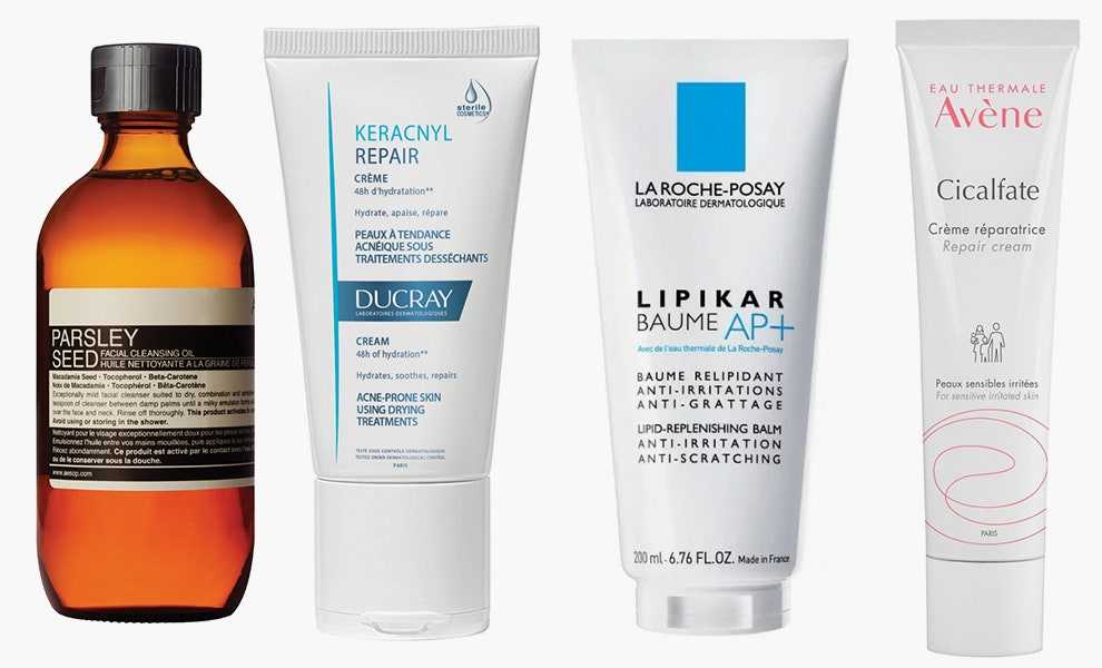 Aesop, масло для умывания Parsley Seed, 3920 рублей, tsum.ru; Ducray, крем Keracnyl Repair, 1217 рублей, ozon.ru; La Roche-Posay, бальзам Lipikar Baume AP+, 484 рубля, laroche-posay.ru; Avène, крем Cicalfate, 716 рублей, ozon.ru