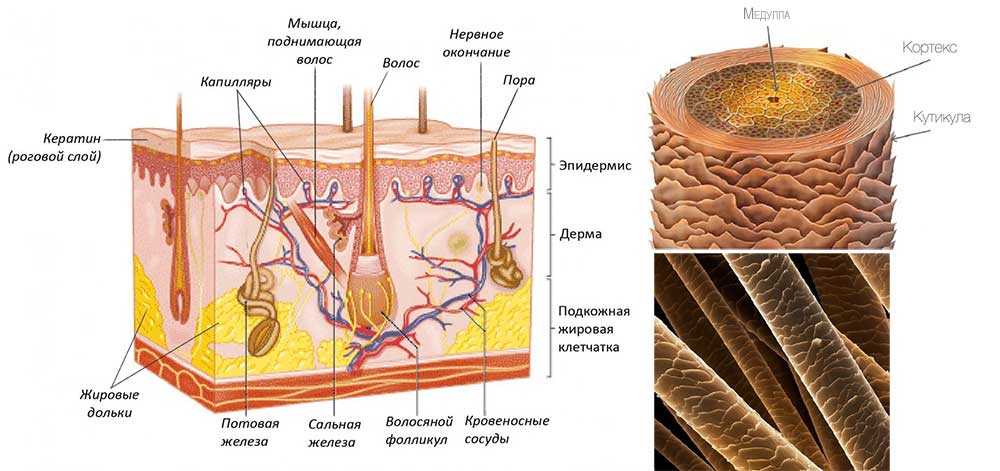 Волосы состоят из двух основных частей. Наружная называется стержнем и состоит она из кератина – белкового вещества. Внутренняя – это фолликул (корень) с нервными и кровеносными окончаниями, железами и мышцей, которая их приподнимает. Иначе эта часть называется матрикс.