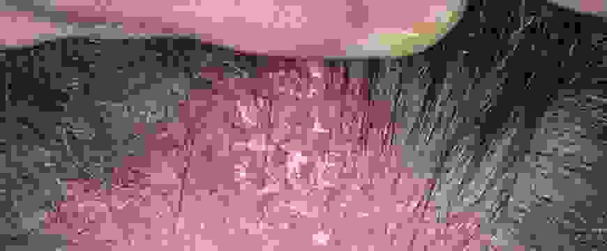 - дальнейшее поскабливание приводит к появлению на поверхности капелек крови – «кровяной росы».