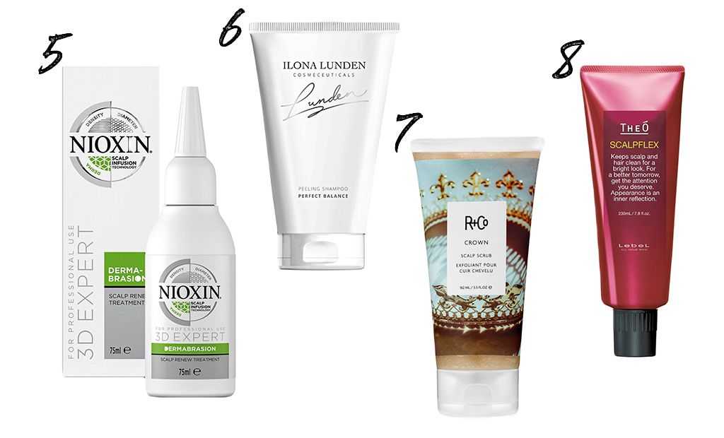 5 — pегенерирующий пилинг для кожи головы Dermabrasion 3D Expert, Nioxin, 6 — пилинг-шампунь для глубокого очищения кожи головы Ilona Lunden, 7 — скраб для кожи головы Корона, R+Cо, 8 — пилинг для кожи головы Lebel TheO Scalp Flex