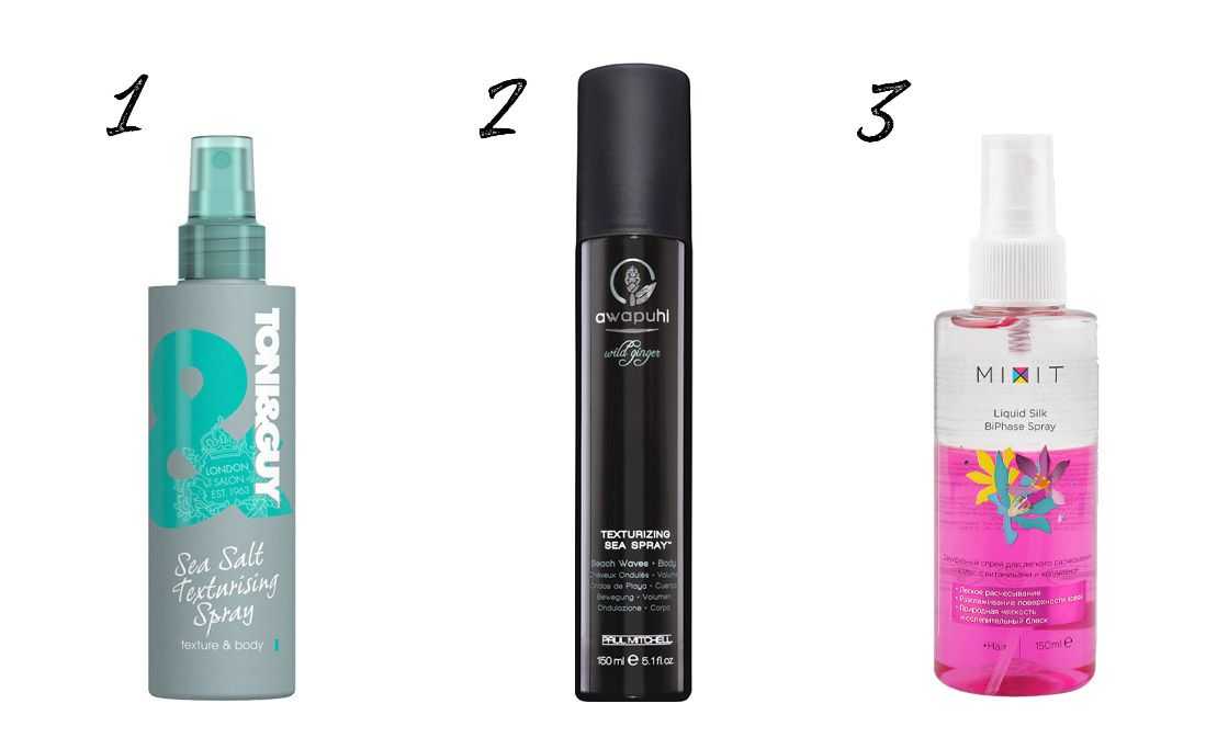 1 — текстурирующий спрей, Toni&Guy; 2 — текстурирующий спрей, Paul Mitchell; 3 — двухфазный спрей для легкого расчесывания волос, Mixit
