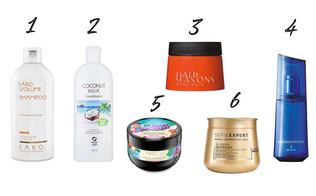 1 — шампунь с гиалуроновой кислотой для увеличения объема тонких волос, Labo Crosprophar; 2 — кондиционер для нормальных волос Coconut Milk, Easy Spa; 3 — увлажняющая маска Hair Seasons Treatment Moisture, Demi Professional; 4 — питательное масло для жестких и густых волос Iceberg Moist, Demi Professional; 5 — увлажняющая маска для волос, Eveline; 6 — маска для сухих и поврежденных волос с кокосовым маслом и глицерином, L’Oreal Professionnel