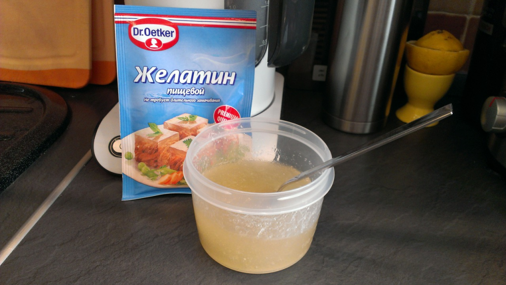 В 50 грамм воды необходимо добавить 15 грамм желатина и нагреть смесь (не доводя до кипения). Затем следует добавить 15 грамм бальзама для волос и всё тщательно перемешать. Можно также добавить несколько капель касторового, оливкового, миндального или репейного масла или же масляный раствор витаминов A и E.