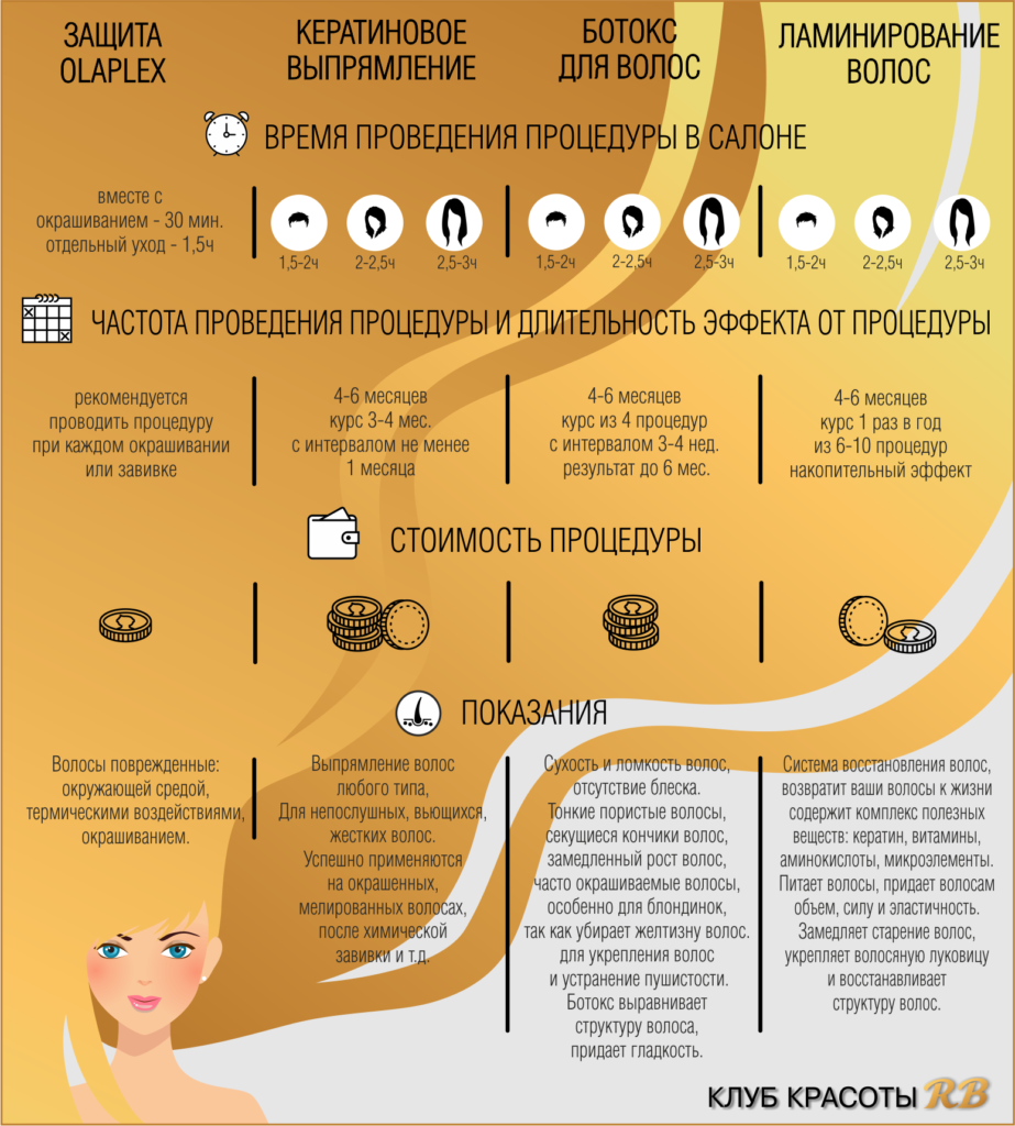 Красивые волосы — это несомненное преимущество для любой женщины. Но к сожалению процедуры которые делают нас красивым: окраски, завивки, выпрямление волос, укладки частое мытье и сушка феном не улучшают состояние волос. О волосах нужно заботиться так же как и вашей коже. Именно поэтому в нашем клубе мы предлагаем вам самые популярные и эффективные методы для ухода за волосами: ламинирование волос, фитоламинирование, кератиновое выпрямление волос, ботокс для волос, защита Олаплекс. В Клубе красоты RB используются препараты последнего поколения, только лучших производителей, что гарантирует вам максимальный эффект от любой процедуры.
