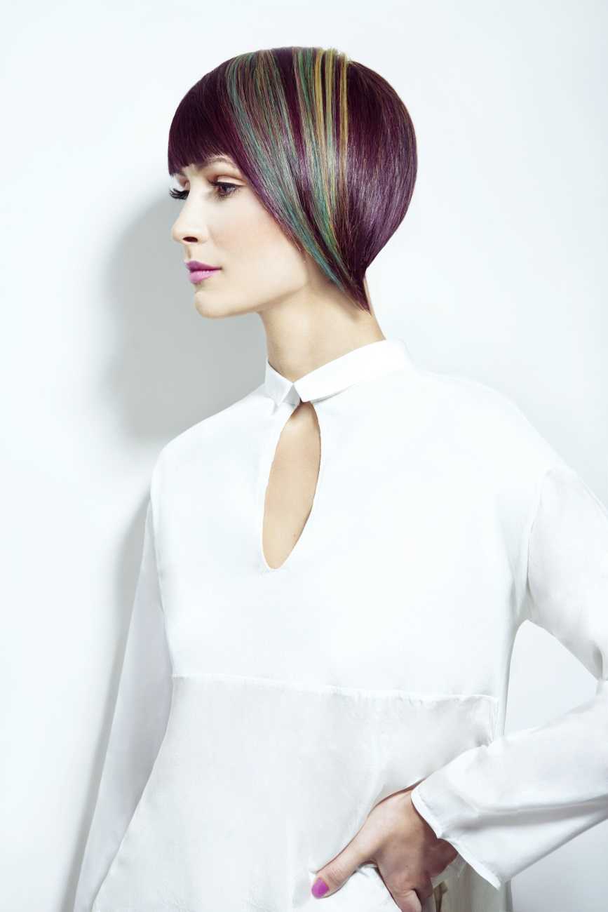 Радужные блики тоже выглядят необычайно круто. Это прекрасное радужное окрашивание идеально подходит к коротким волосам. Для получения этого шикарного модного цвета выбирайте оттенки индиго, небесно-голубой лазури, баклажана, лаванды, розы и сапфира. Эта комбинация цветов выглядит еще более впечатляюще на гладком А-образном бобе с удлиненными передними прядями, мягко обрамляющими лицо. Добавьте к этому образу нежно-розовые тени для век и матово-розовую помаду — и вы почувствуете себя настоящей принцессой!