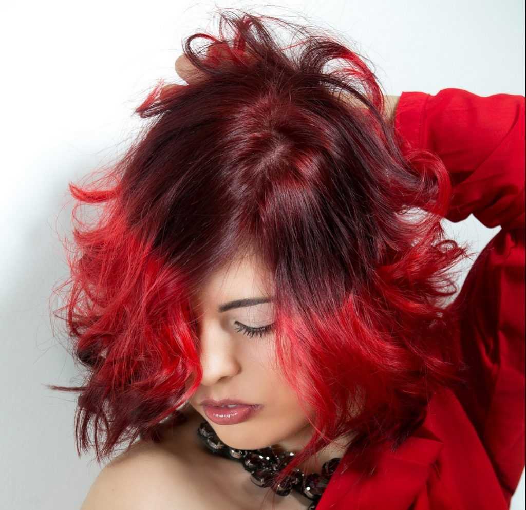 Для создания оригинального образа выполняется цветное колорирование. На темных волосах разноцветные локоны выглядят особенно выразительно. Оттенки ярко-красного, розового, изумрудного, синего, зеленого способны подчеркнуть индивидуальность девушки. Для создания зрительного объема подойдут красные, фиолетовые оттенки. Главная задача цветного мелирования – выделить несколько отдельных прядок яркими тонами. Палитра может доходить до десяти тонов. Ярким брюнеткам подойдут красные тона, а также фиолетовая и синяя гамма оттенков, которыми богата палитра цветов краски Рябина.