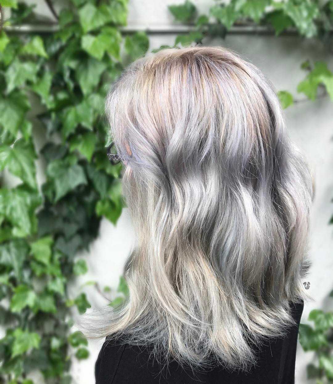 На фото в последние годы можно заметить девушек с светло-пепельным цветов волос с дополнительными оттенками — розовым или фиолетовым. Мастер использует вместе с краской для волос пепельно-русого оттенка цветную тонировку. Нужно обращаться к проверенному мастеру, ведь это окрашивание относится к сложным.
