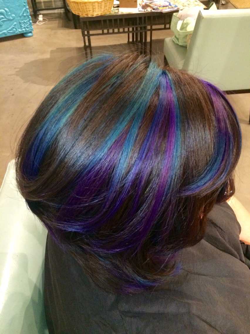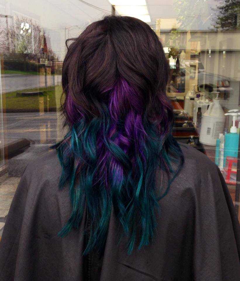 Яркий и эффектный лук получается с помощью цветного мелирования. Применяется техника дип-дай и peek-a-boo – низ окрашивается в тёмный или яркий оттенок, который контрастирует с основным тоном. Популярными остаются также цветные пряди – фиолетовые, красные, синие.