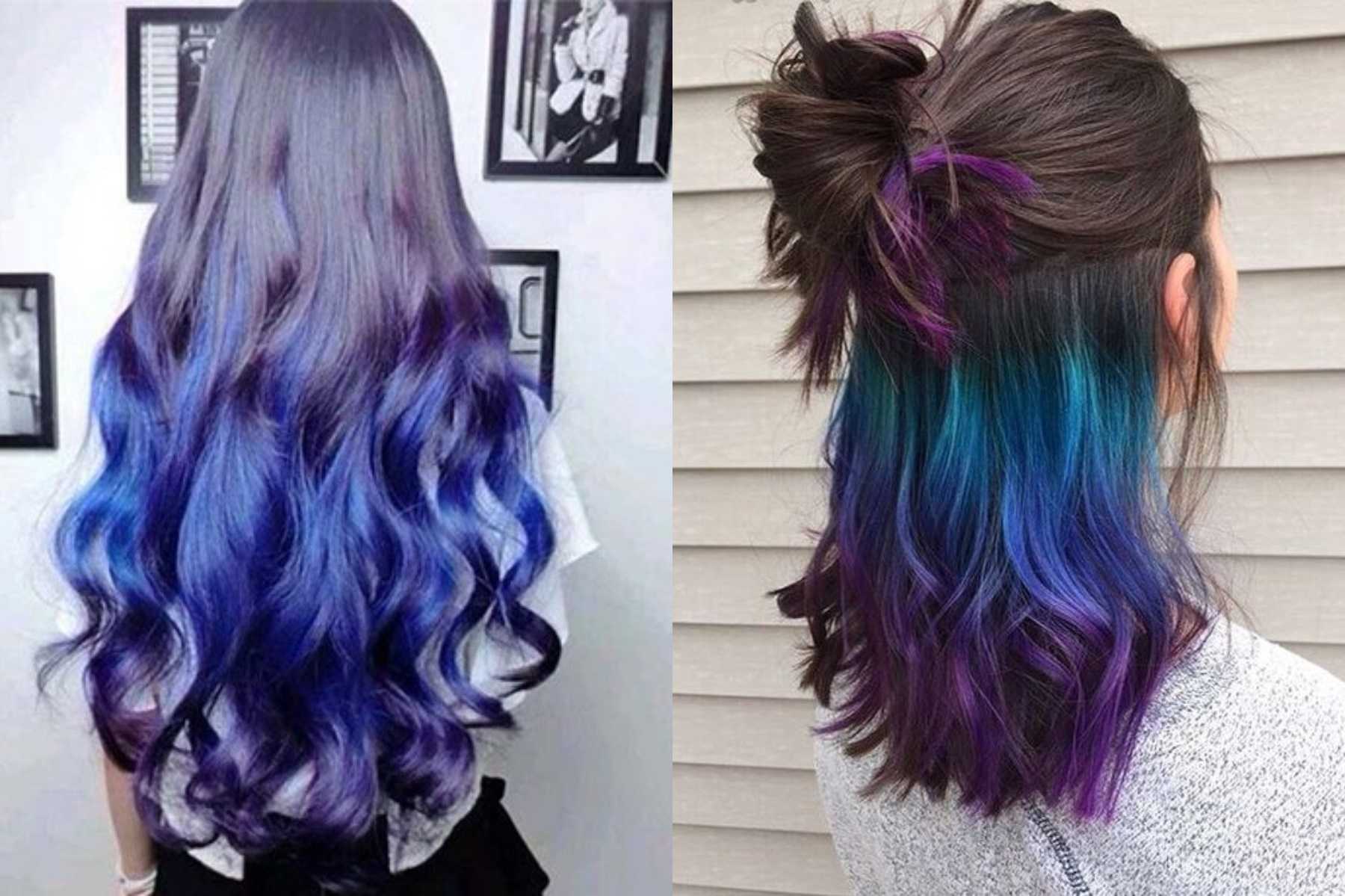 - Хорошим вариантом станет темный оттенок синего, который напоминает воду на дне океана. Базовый цвет должен быть супер темным, он почти черный, но кончики прядей могут быть слегка светлее. Если есть желание, то можно пойти и дальше и окрасить их в контрастный голубой. Обладательницам темных локонов можно оставить свои корни, эта комбинация цветов может немного сгладить экстравагантность лука.