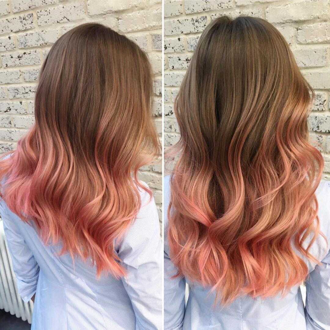 Оттенок персика подразумевает розовые пряди или полную окраску на светлых волосах. Этот цвет появился совсем недавно, но уже можно увидеть много девушек, которые выбирают для себя такой вариант. Скорее всего они предпочитают такое окрашивание из-за его нежности и в тоже время необычности. Это не яркий розовый, который шокирует окружающих, а мягкий оттенок.