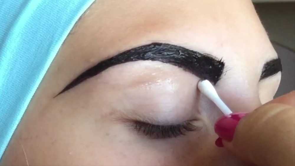 В конце процедуры излишки красящего состава удаляются ватным тампоном. Особенно аккуратно это надо делать в случае с хной, удаляя сначала краситель в области переносицы одновременно с двух сторон, так как в этом месте волоски должны быть чуть светлее. Остаток красящего средства смывается водой.