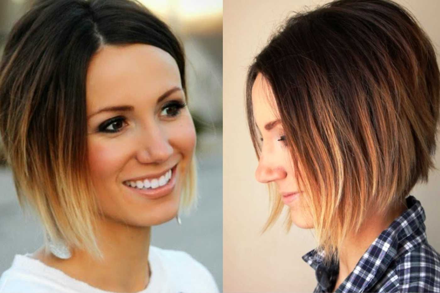 Оригинально смотрится омбре на темные и короткие волосы. Как выглядят подобные прически, вы можете посмотреть на фото. Для темных прядей можно сделать традиционный вариант омбре, при котором оттенок плавно перетекает от темных корней к более светлым кончикам.