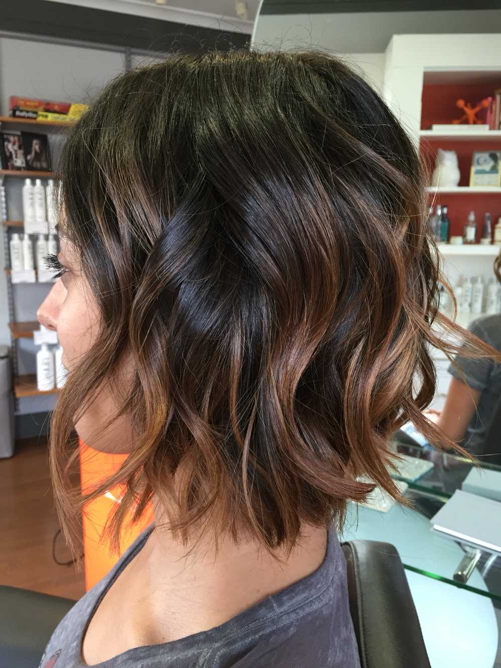 Такая стильная покраска волос в темные цвета на средние волосы представлена на фото ниже: