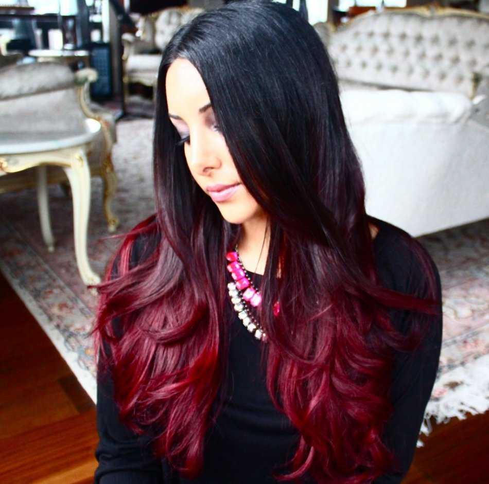 Омбре бордовым цветом на черные волосы
