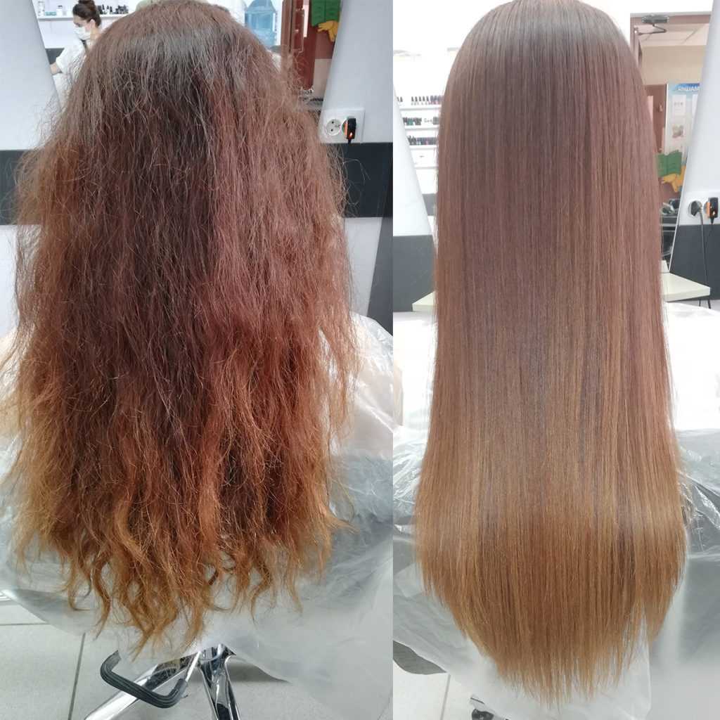 - процедурные – кератиновое выпрямление кудрей, например. В этом случае происходит определенная химическая реакция, благодаря которой нарушаются некоторые связи в структуре и волосяной стержень теряет форму. Некоторые из них довольно агрессивны, некоторые даже рекомендуются для защиты при слишком хрупких прядях;