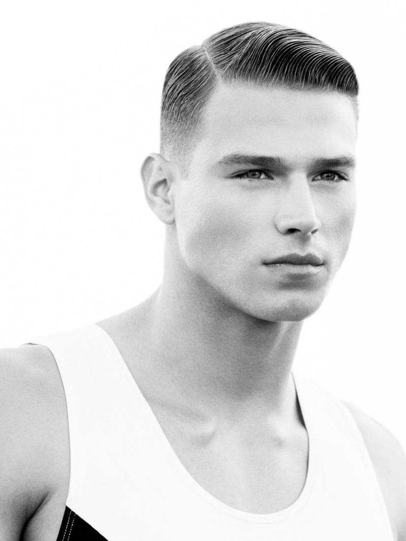 Такая прическа подразумевает более резкий переход, коротко выбритые виски и челку не длиннее 5-6 см, аккуратно зачесанную назад. При желании ее можно зафиксировать гелем или лаком, чтобы прядки не мешали во время тренировки, а затем уложить набок, получив при этом головокружительный образ мачо.