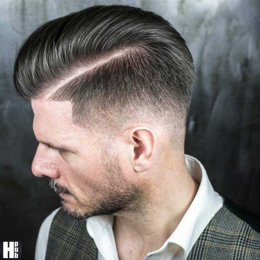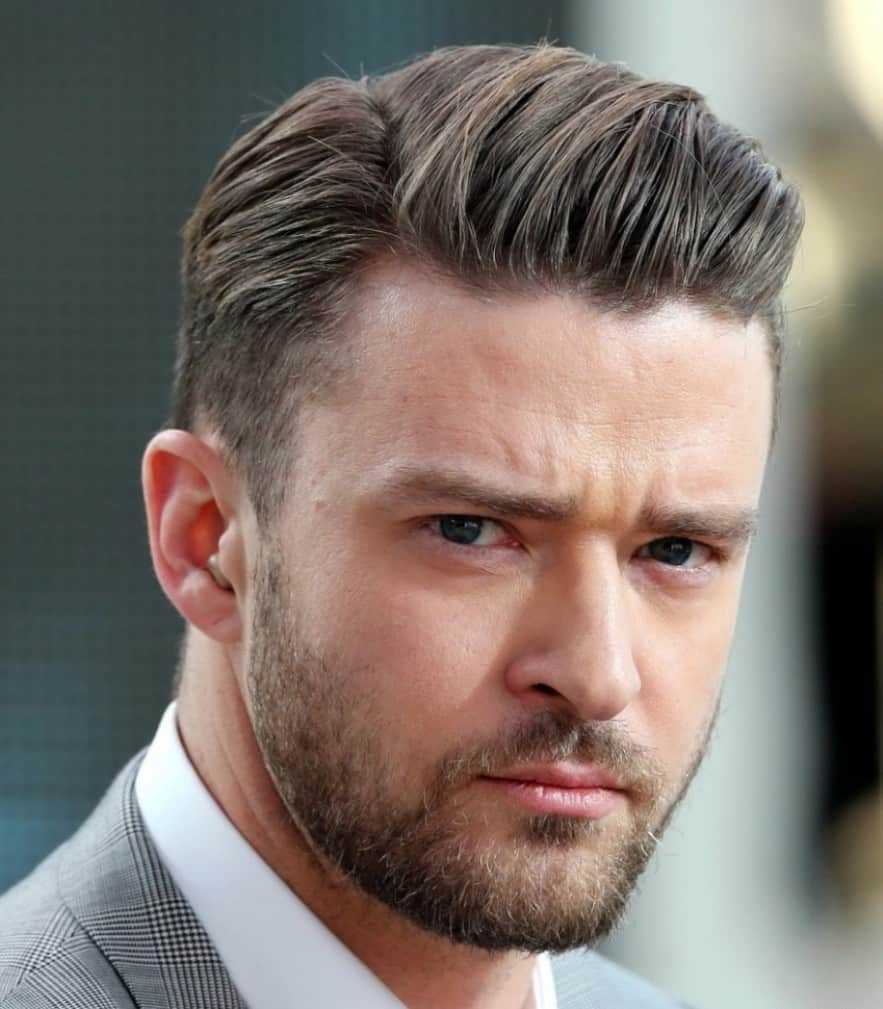Классический вариант мужской прически британки выглядит сдержанно и элегантно благодаря смягченному фейду между затылочной частью и макушкой. В этом случае виски выбриваются не слишком коротко, а длина челки обычно не превышает 8 см.