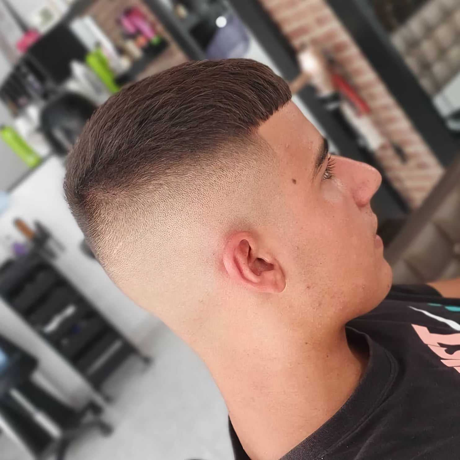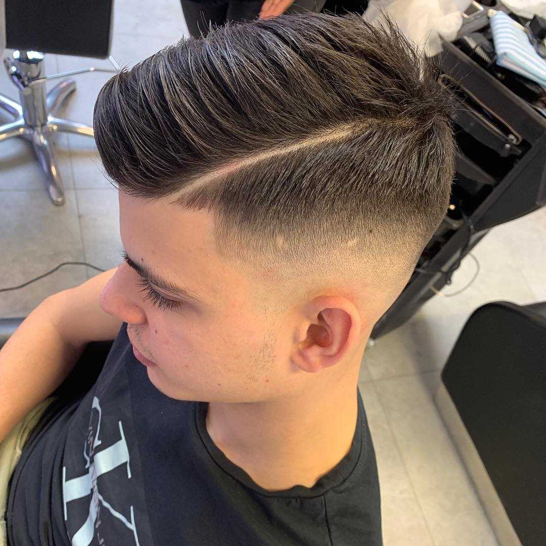 Эта короткая стрижка с фейдом максимально приближена к лысому стилю. Небольшая вертикальная полоска коротких волос должна постепенно переходить в облысение от виска к центру затылка. Этот образ очень мужественный, но, благодаря выбриванию, еще и стильный.