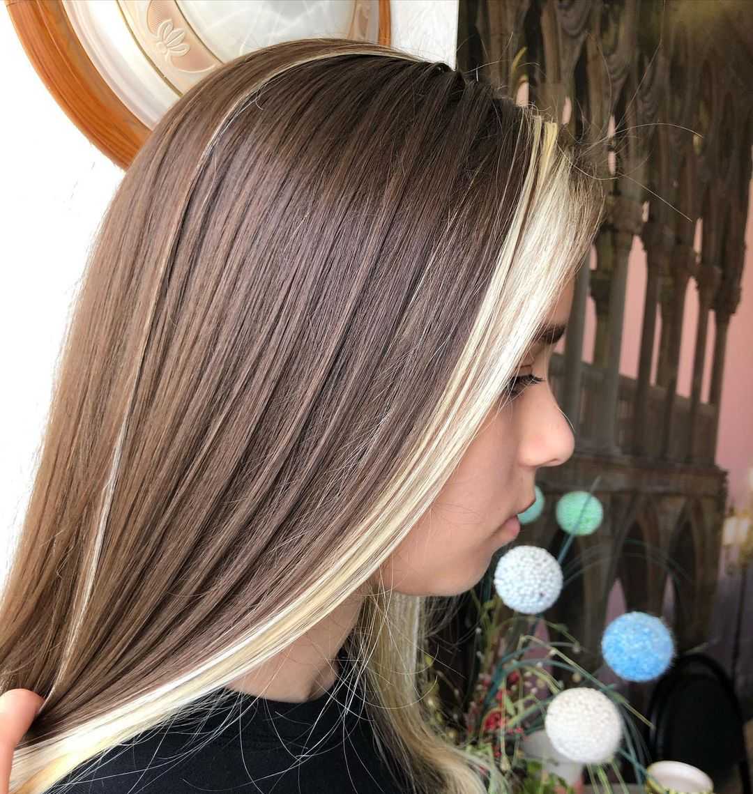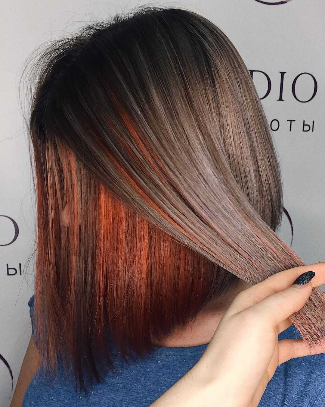 Скрытое русое окрашивание не очень популярно, но такой метод подойдет брюнетам, блондинкам и рыжим. Под определенным пробором или при поднятии волос будут проглядывать русые локоны.