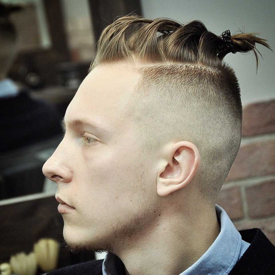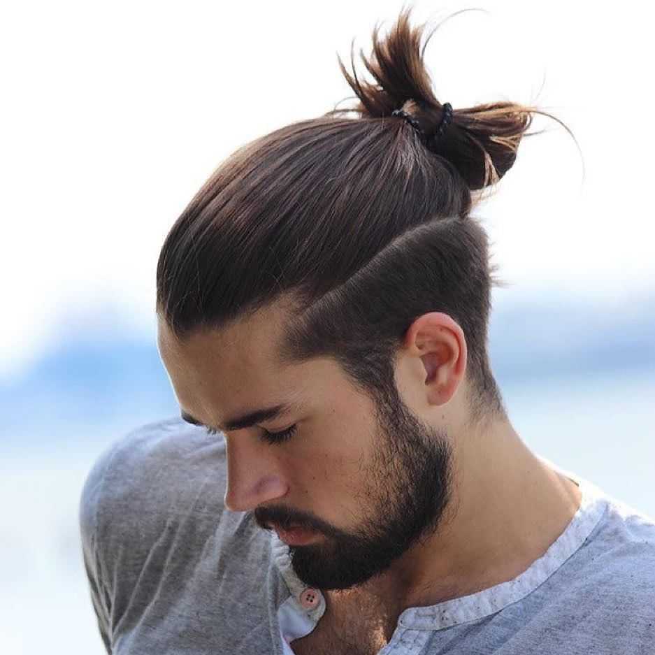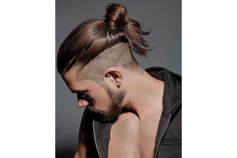 С пучком. А эта стрижка – новинка наступившего сезона. Но конечно, смогут ее позволить себе только обладатели длинны волос. Основная особенность – формирование небрежного пучка на затылке или чуть выше. Также очень часто можно встретить гибрид этой прически с андекартом, когда пучок формируется только из волос, находящихся на макушке. А вески и затылок при этом коротко пострижены. Многие стилисты рекомендуют носить данную стрижку с бородой. Это добавляет образу брутальности.