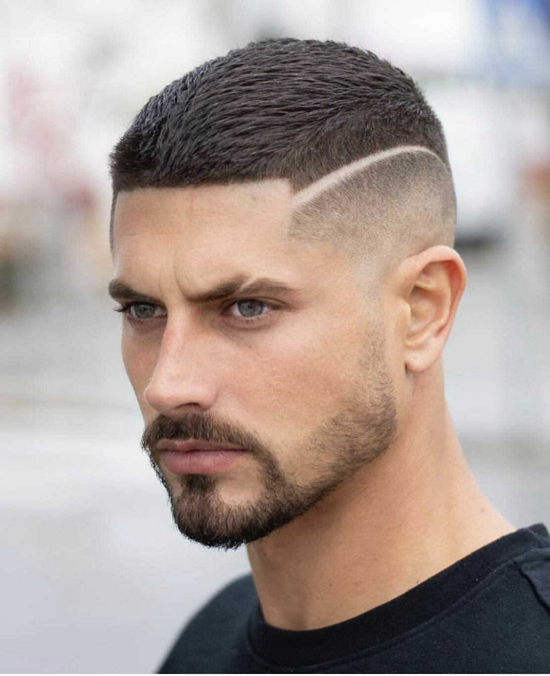 - Мужские спортивные стрижки в 2021-2022 можно оттенить аккуратно выбритым рисунком на одном виске или затылке. Такое дополнение лучше смотрится на темных волосах – так узор получается четче.