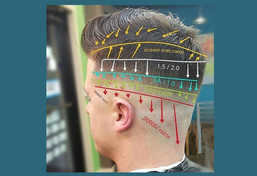 В соответствии с инструкцией, стрижку начинают с височной области против роста волос. Далее выстригается область сзади, на затылке. При этом мастер периодически меняет насадки электрической машинки, чтобы добиться плавного перехода. Так, при стрижке зоны возле ушей используется насадка № 1 (в редких случаях — № 0), затылка – № 2, макушки – № 3.