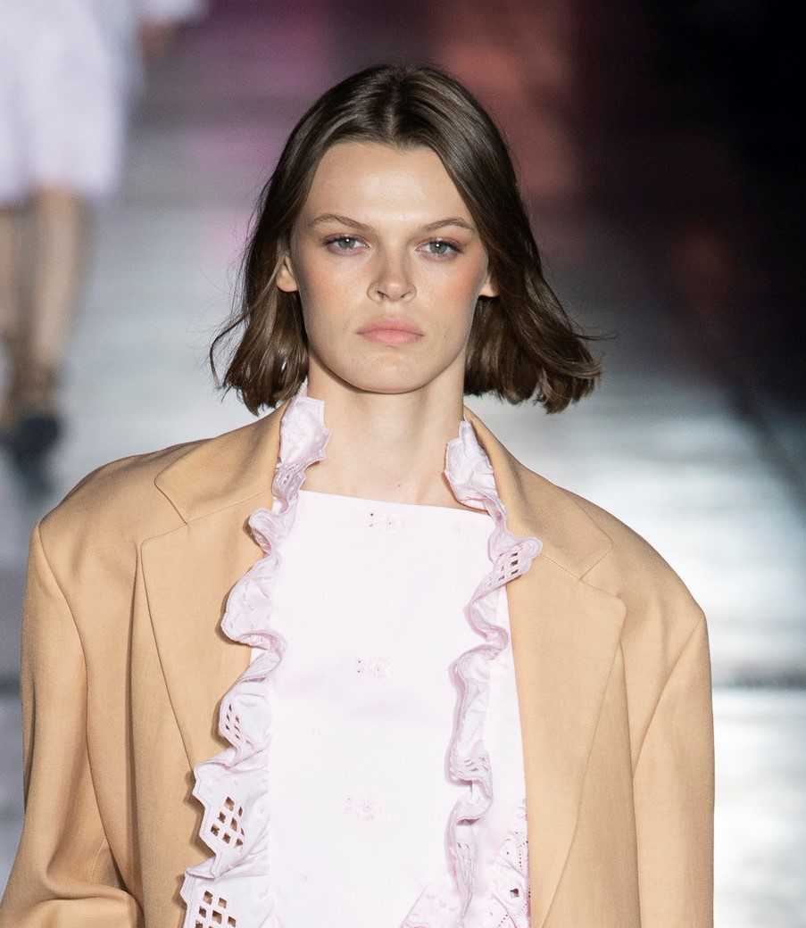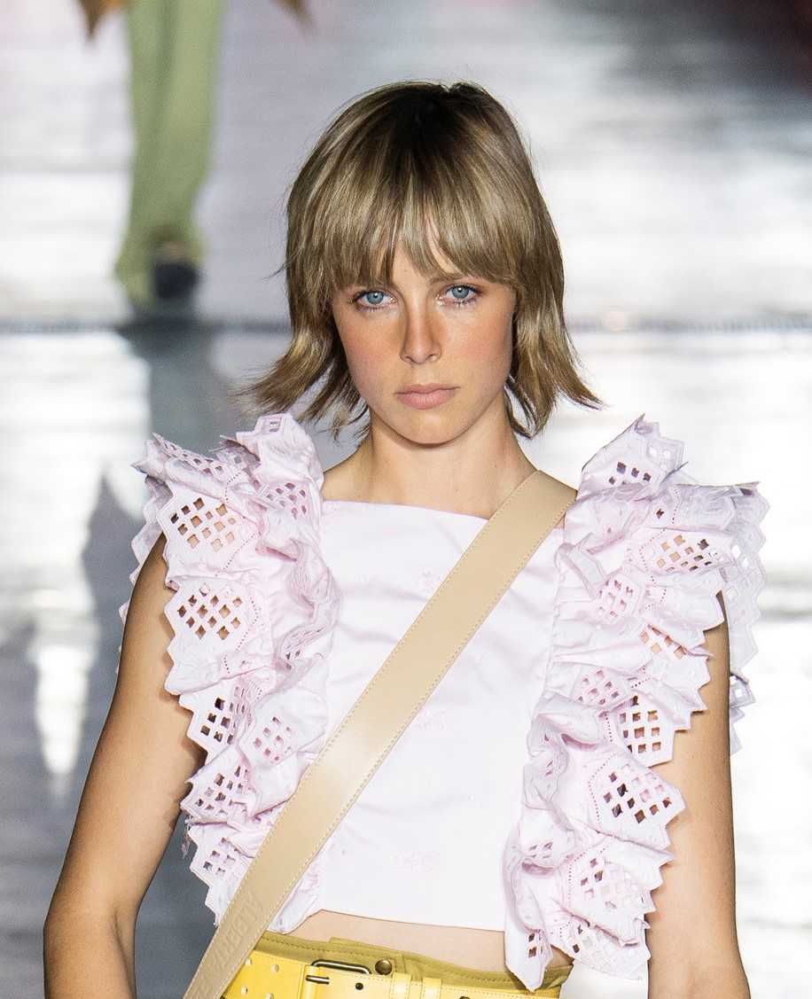 Второй вариант модной челки — разделенная на две стороны отросшая длина. Dries Van Noten представили более расслабленные и свободные прически с растрепанными прядями. В этом есть немного французского шика, а главное — простота укладки. И маленький секрет: именно такой тип челки визуально вытягивает лицо. И если стандартная прямая челка на всегда подходит девушкам с круглым типом лица, то рваный вариант — хорошо выглядит в большинстве случаев.