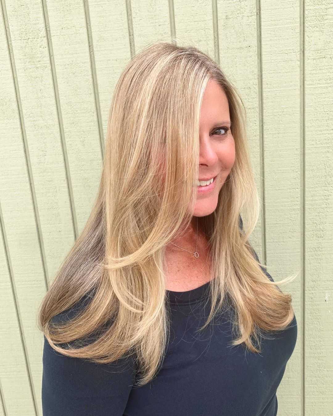 Чтобы визуально вытянуть широкий овал лица, а также придать объем стрижке лесенкой по всей голове на длинные волосы, нужно распределить на локонах немного мусса и просушить при помощи большой круглой расчески и фена, направляя прядки в сторону лица.
