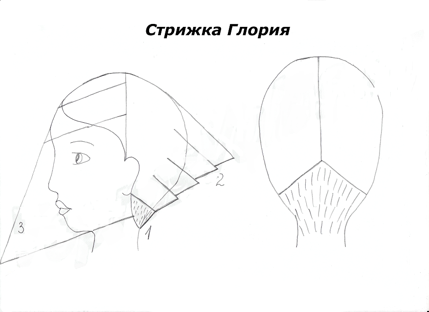 Делая градуировку на короткие локоны, мастер должен иметь опыт с помощью ножниц проводить тушевку волос, как того требуют ниже приведенные примеры схем градуированных стрижек с названиями «Глория», «Олимпия» и «Экспромт».
