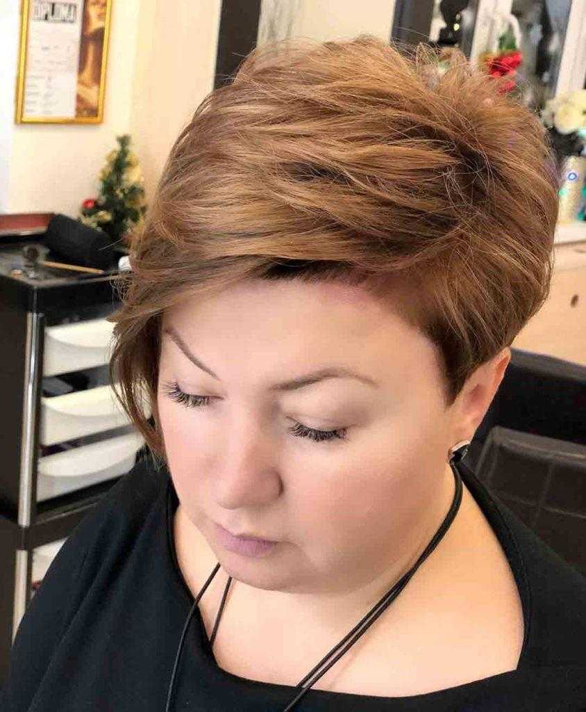 Полным дамам весьма подходят удлиненные варианты пикси. Все дело в том, что таким образом идет гармонизация всего образа в целом, что существенно скрадывает любые недостатки фигуры. Благодаря универсальности удлиненного пикси его легко укладывать, либо вовсе носить без укладки.