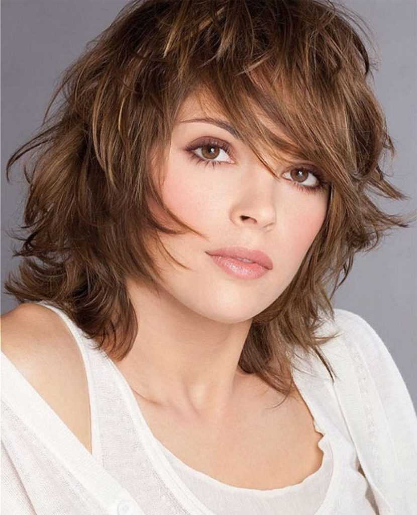 Круглое лицо лучше всего смотрится в обрамлении рваных прядей и асимметричной челки. Чтобы приподнять верх, можно поиграть с разной длиной волос, укорачивая пряди вверху и удлиняя возле шеи.