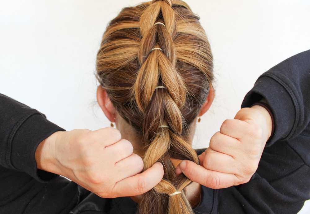 - При необходимости увеличения объема плетения дольки косички растягивают в стороны.