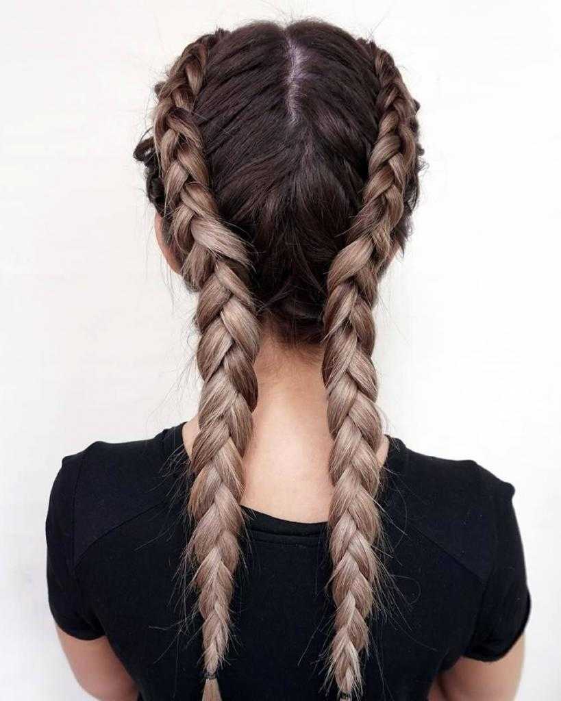 Еще один достаточно интересный способ оформить прическу из косичек − это плетение в две косы.
