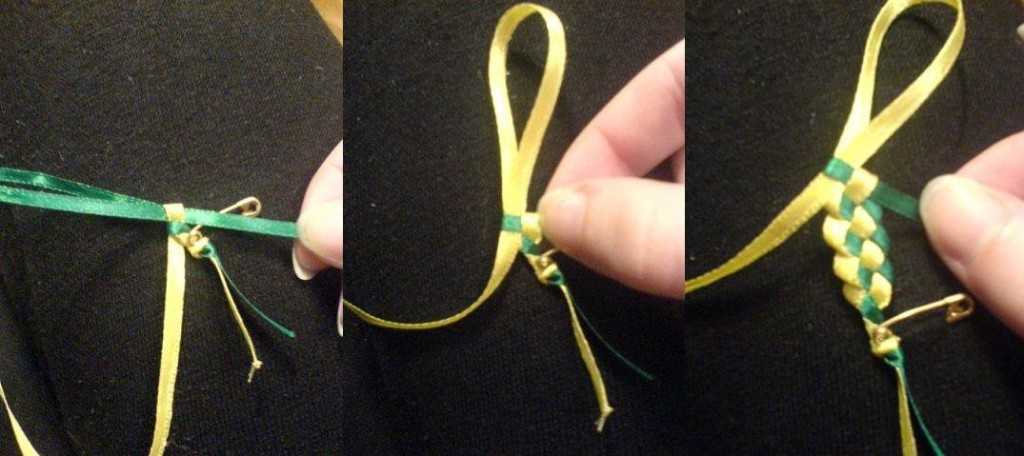 3. Для большего удобства на первоначальных этапах плетения помогайте себе небольшой булавкой. Она позволит вам избежать нежелательного выскальзывания лент из петель.