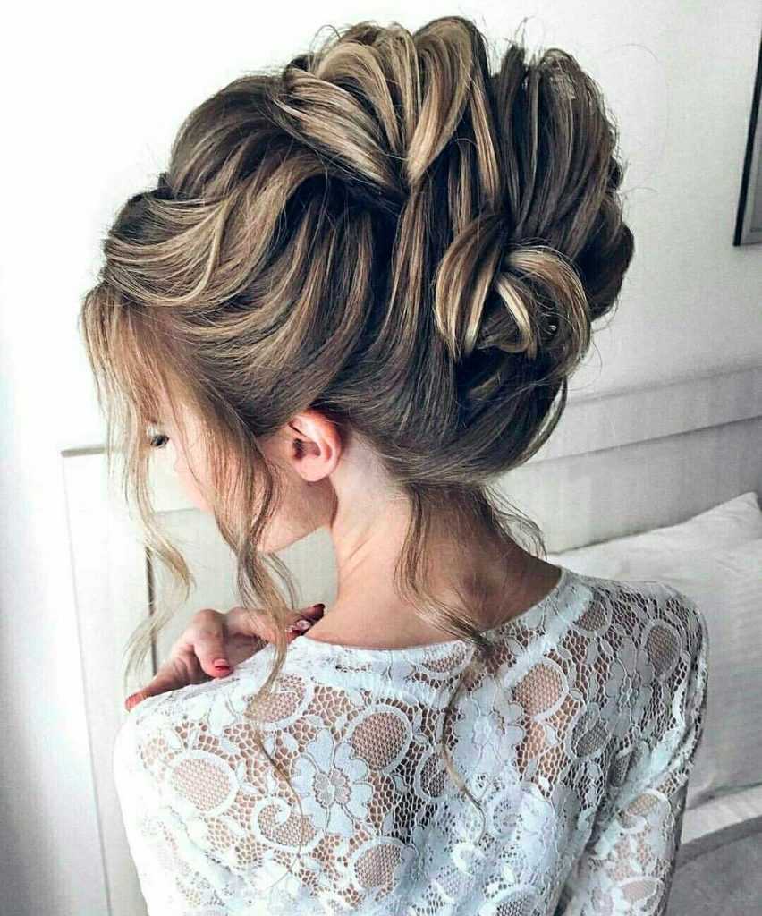 - Высокий. Часто используется для невест. На волосах создаётся большой объём, височные зоны украшаются тугими косами необычного плетения. Украшение – стразы, жемчужные нити, ленты.