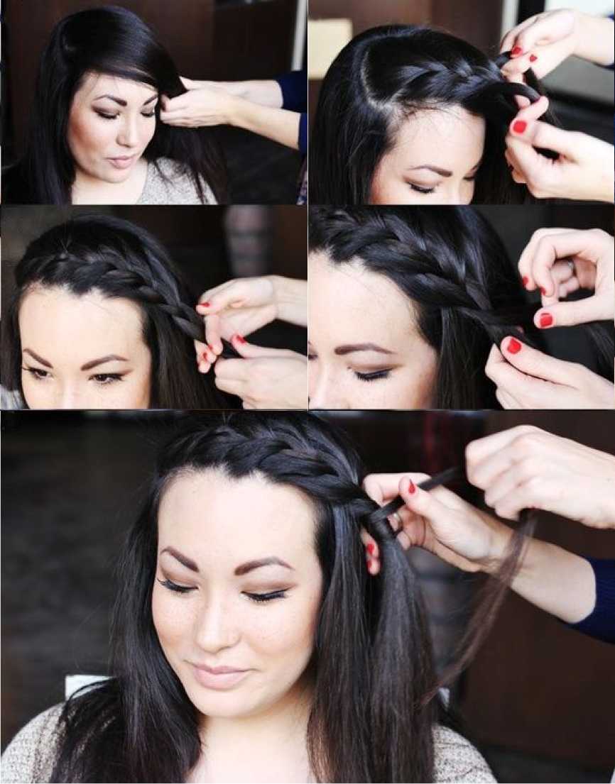 - если вы обладательницы красивой челки, ее легко можно заплести в косичку, тогда начните создавать «дракончика» с нее. Челка может и не использоваться, просто красиво уложите ее или заколите на желаемую сторону;