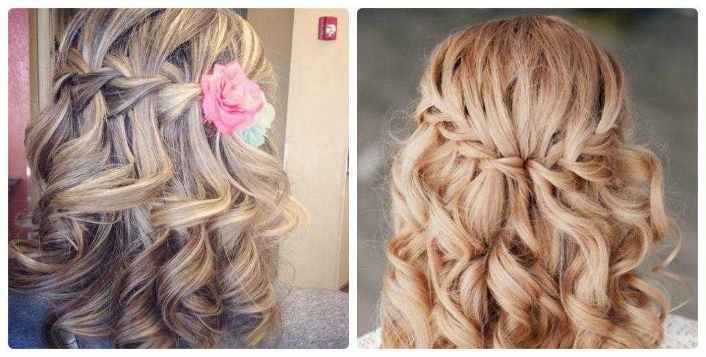 Для праздничных «Водопадов» чаще плетется объемная коса, используется начес, локоны. Волосы не обязательно оставлять распущенными. Популярно выполнение пучка. Допустимо собрать сложную конструкцию.