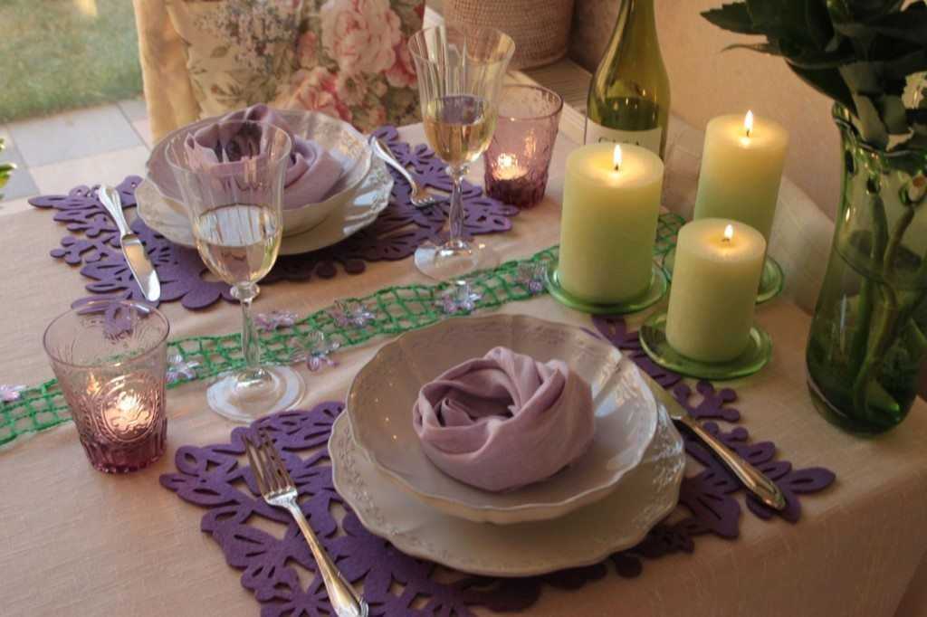 Скатерть лучше выбрать шелковую либо из любого другого струящегося материала. Возможно ее двухслойное исполнение, при котором один из слоев обязательно белый и воздушный. Оригинальными считаются варианты скатертей из льняного полотна натуральной окраски. Тогда такое действо приобретает нотки стиля этно и требует соответствующей посуды (лучше, глиняной).