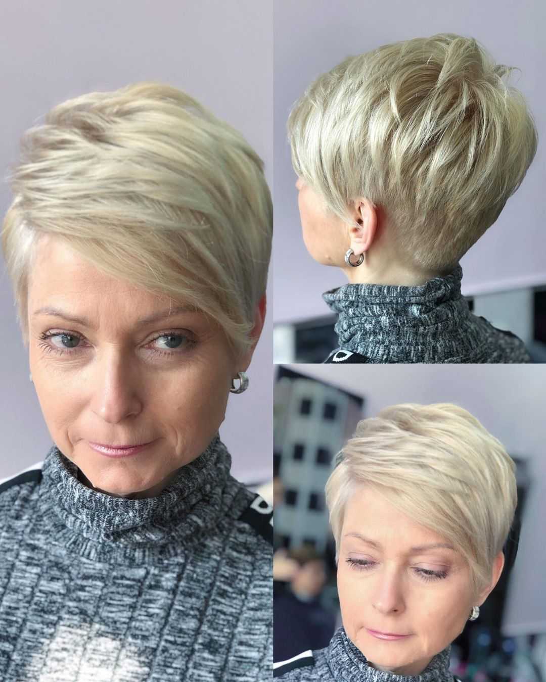 Универсальная стрижка является настоящей находкой для женщин средних лет. Она создает как элегантный, аристократичный образ, так и игривые варианты с выбритым затылком и виском. Для бизнес-леди подойдет классическое короткое решение, которое способно омолодить внешность и гармонизирует пропорции тела