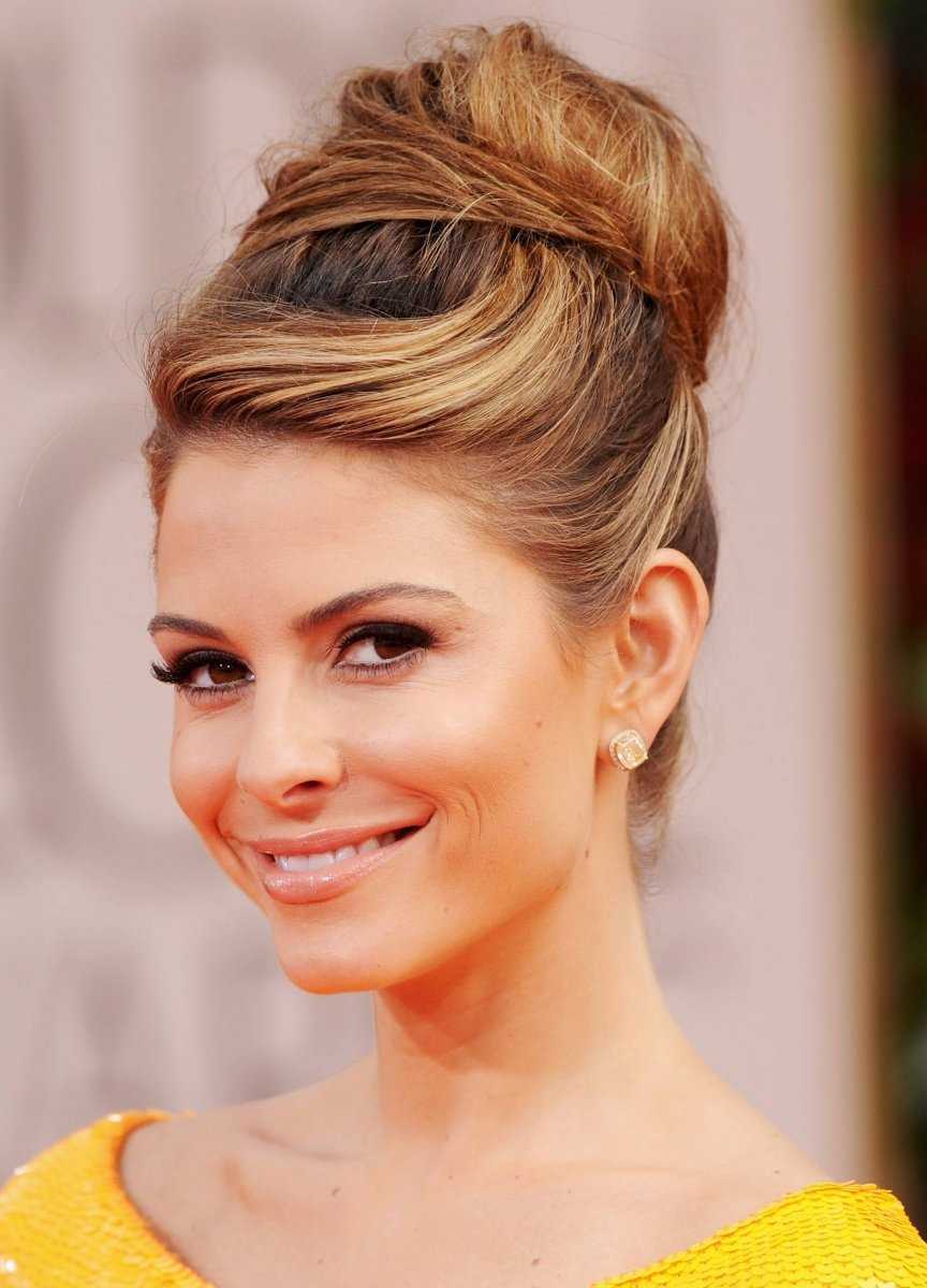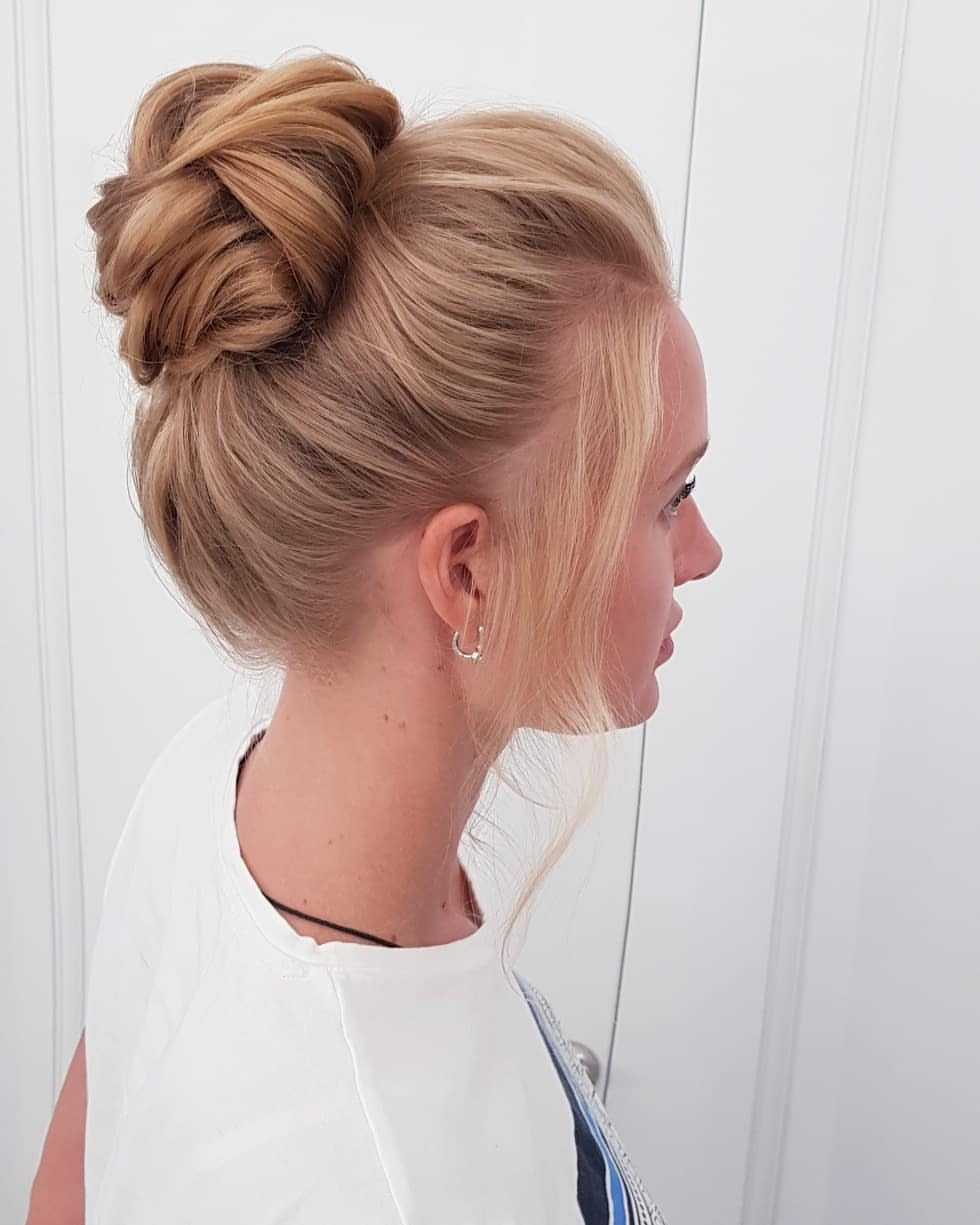 Прическа для торжественных случаев, которая поможет выглядеть визуально выше. Высокие пучки идеально подходят обладательницам волос одинаковой длины, которые не будут выпадать из прически. Тренд последних сезонов – пучки с элементами плетения. Косички, которые аккуратно вплетаются в пучок, великолепно выглядят в деловых образах.