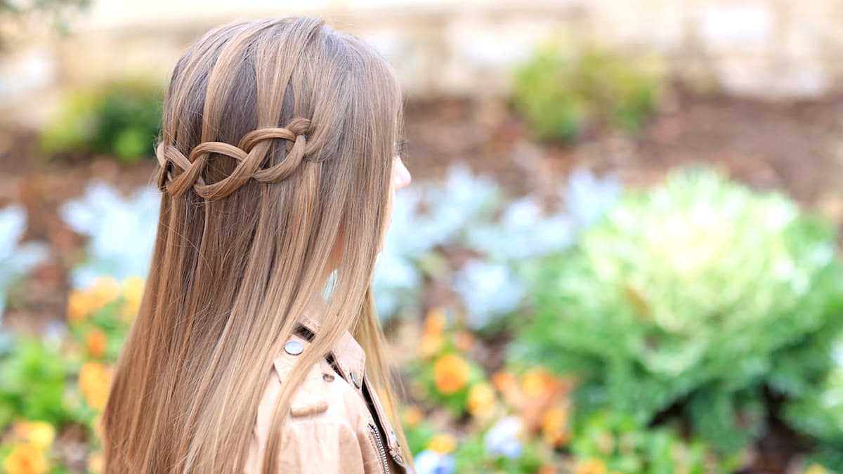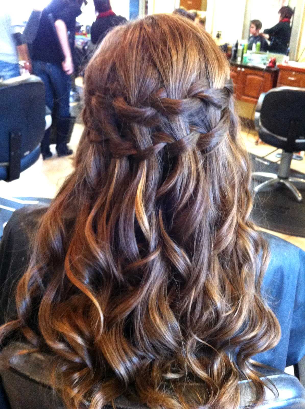 Коса-водопад считается по праву самой изящной и романтичной прической. Укладка сочетает в себе распущенные волосы и горизонтальную косу по всему периметру головы. Концы лучше завить плойкой для добавления прическе универсальности.