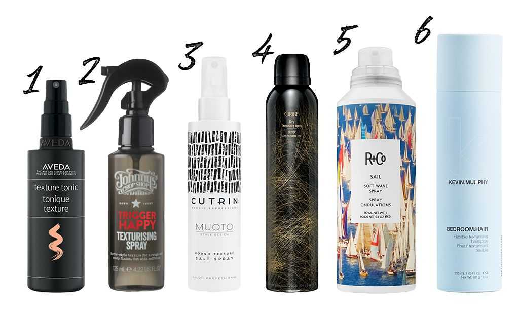 1 — тоник-спрей для создания текстуры Aveda, 2 — текстурирующий солевой спрей для волос Johnny’s chop shop, 3 — солевой спрей для раф текстуры волос Cutrin, 4 — cпрей для сухого дефинирования с лак-текстурой Oribe, 5 — текстурирующий спрей «Открытое море» R+Co для создания пляжных волн, 6 — текстурирующий спрей для волос Bedroom hair с подвижной фиксацией Kevin Murphy