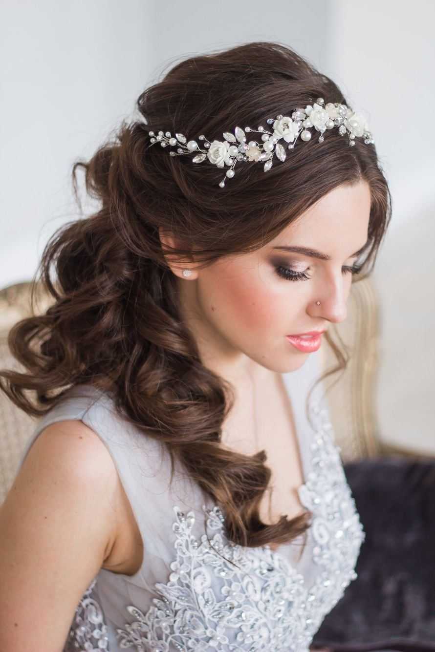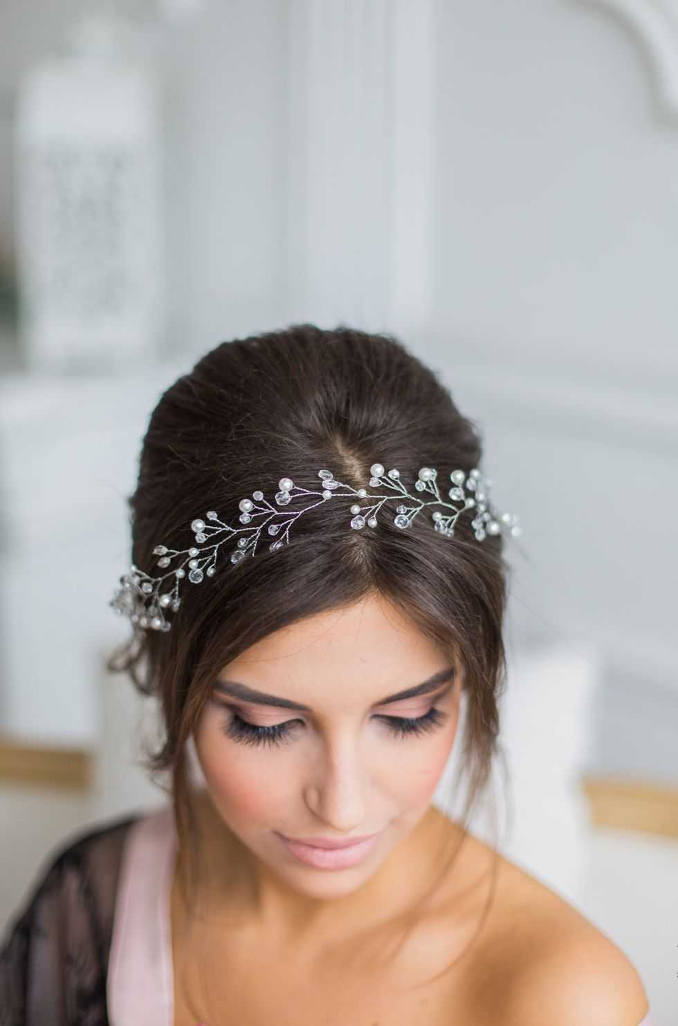 Диадема внешне очень похожа на корону или тонкий ободок, превращая невесту в настоящую принцессу из сказки. Лучше всего она будет смотреться в сочетании с накрученными крупными локонами. Сильно объемные прически не подойдут, потому что перегруженность деталями испортит впечатление об образе и приведет гостя к растерянности. Чтобы диадема прочно сидела нужно подобрать аксессуар с горизонтальным гребнем.