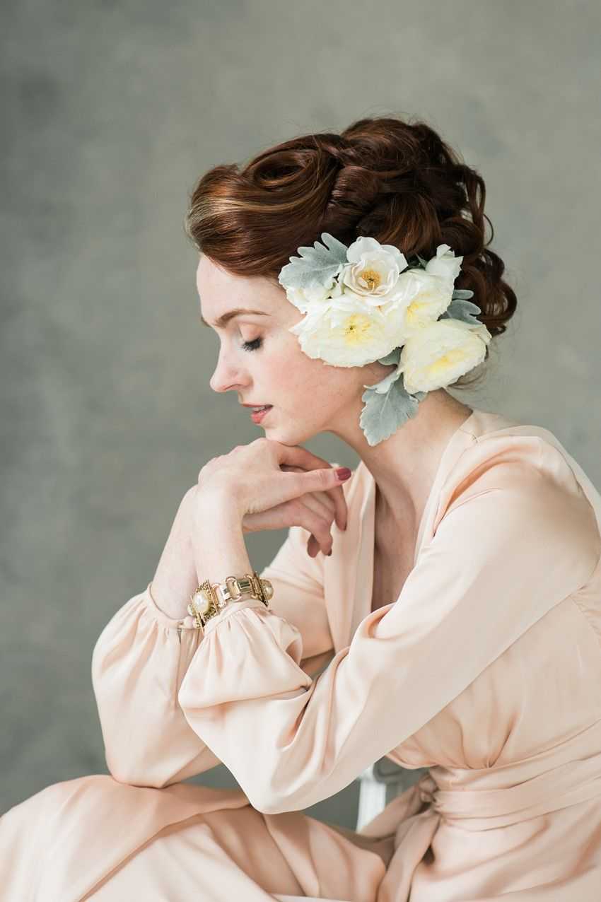 Это могут быть уложенные на одну сторону косы или завитые локоны, либо же аккуратный или нарочито небрежный пучок, из которого будут выбиваться пряди, красиво обрамляющие личико невесты. Также это могут быть уложенные на бок волнистые волосы в стиле 40-х.