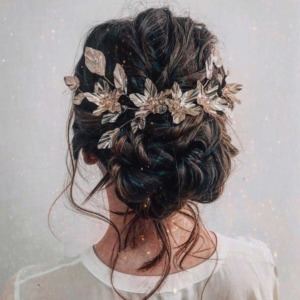 Украшения подбираются в зависимости от покроя, плотности и цвета платья, а также непосредственно от самой прически. Это могут быть стразы, нити с нанизанным на них жемчугом, перья, разнообразные шляпки, фата, ободки для греческих причесок, венки из настоящих и искусственных цветов, разнообразные заколки и декоративные зажимы
