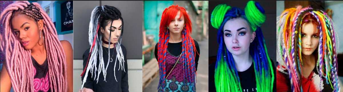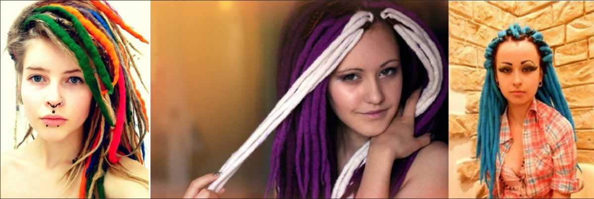 Цветные дредлоки создаются с помощью канекалона. Он бывает как однотонным, так и разноцветным (хамелеон, омбре). Такой вид хорошо сочетается с челкой и подойдет креативным людям, которые хотят выделиться из толпы и любят современное «арт» искусство.